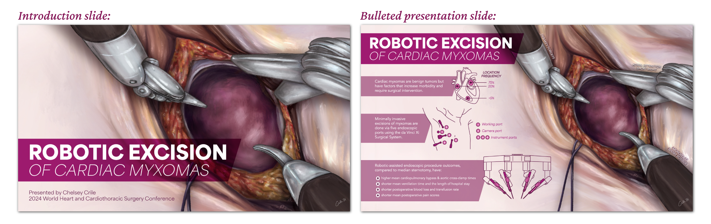This mockup was created with the 2024 World Heart and Cardiothoracic Surgery Conference in mind, where a proposed presenter would discuss the research of robotic assisted endoscopic surgeries to excise cardiac myxomas. The illustration showcases the instruments used by the da Vinci Xi surgical system, gives an overview of why surgical intervention is necessary, and compares robotic surgery to that of the conventional approach (median sternotomies).